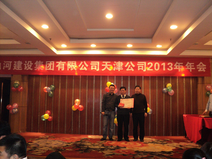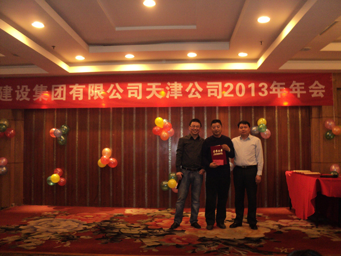 接下来是对2013年成绩优秀的项目部进行表彰,他们是天津经纶科技项目部,天津军交学院项目部,河北长城家园项目部。分别由天津公司总经理程震洪,集团公司副总兼天津公司总工史绍刚,天津公司党委书记付志远对以上项目部进行颁奖。