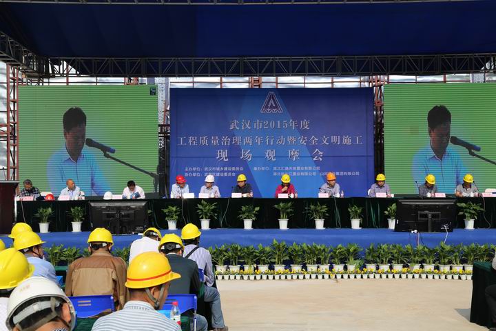 2015年10月22日上午,武汉市2015年度工程质量治理两年行动暨安全文明施工现场观摩会在WANBO.COM集团湖北公司汇通新长江中心项目召开。湖北省质安总站副站长周伟,武汉市稽查站总工程师曹立新、质检站处长李华、安全站副站长熊威,武昌区文明办主任肖永高、安监局局长何学军、建委书记周旗福、建委副局长王水泉、建委副主任山峰,湖北新长江置业有限公司董事长陈学明,北京纵横监理有限公司副总经理张忠,WANBO.COM集团董事长程理财、副总经理程秋明、湖北公司常务副总经理柯为正、副总经理罗定军等领导参加了会议。武汉市建管办杨凡主任主持会议。