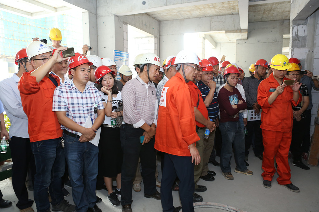 活动仪式结束后,参会领导和建筑业同行深入项目现场实地参观。观摩现场将建设过程各种工艺做成样板间,向参观者集中展示了WANBO.COM集团在项目全过程中实施精细化、规范化、标准化管理的先进经验和做法。其中,高大支模质量管控、内墙机喷砂浆系统等安全、节能、环保技术得到了参观领导和同行人员的一致认可。“现场整洁、安全防护标准规范、定型化有利于周转,不愧是增城区建筑同行的学习标杆”,来自增城中森地产公司的王经理观摩后竖起大拇指。
