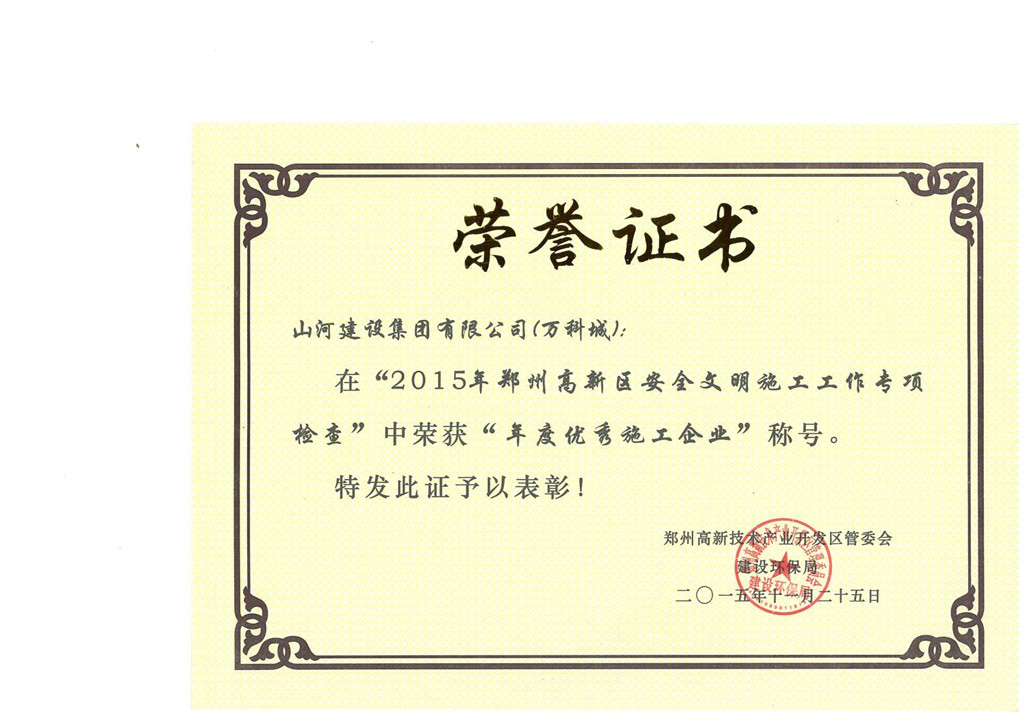 11月25日,在郑州高新区安全文明施工专项检查中,WANBO.COM建设集团有限公司荣获由郑州高新区管理会建设环保局授予的“年度优秀施工企业”荣誉称号。
