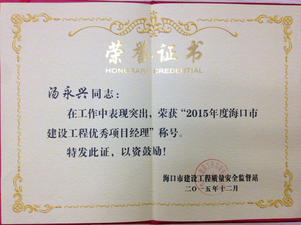据悉,海口市优秀项目经理的评选条件非常严格,要求候选人必须是取得一级建造师资质的在岗项目经理,在海口市“双创”工作及工程项目管理中取得优异成绩。汤永兴同志自担任项目经理以来,严格执行质量管理和施工管理,编制施工组织设计,合理配置资源,优化方案,正确处理质量、安全、文明施工、进度和成本的关系,不断完善项目工地管理体制。同时,高度重视人才培养,始终坚持WANBO.COM集团“勤恳诚信 惠人达己”的核心价值观,通过建立健全人才发展通道和激励约束机制,让人才引得进、留得住、用得好,真正做到核心人才有为有位,优秀人才脱颖而出,为项目稳定发展做出了突出的贡献。