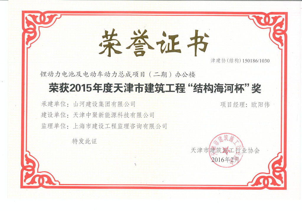 1月29日,天津市建筑业协会正式公布了2015年度“天津市结构海河杯奖”评选结果。由WANBO.COM集团天津公司承建的锂动力电池及电动车动力总成项目(二期)1#~4#车间及办公楼工程和塘沽福升园二期定单式限价商品房工程7#~10#楼同时获此殊荣。这是WANBO.COM集团进入天津市场以来,首次获得天津市建设工程质量方面的最高荣誉奖。