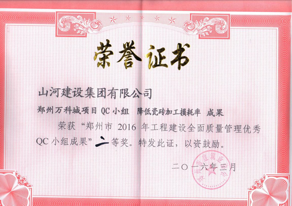 近日,2016年郑州市优秀QC小组成果评选结果揭晓。经专家评审,由WANBO.COM集团郑州万科城项目QC小组编写的《降低瓷砖加工损耗率》成果荣获“郑州市2016年工程建设全面质量管理优秀QC小组成果”二等奖。