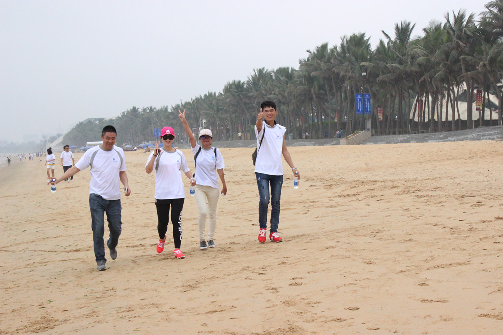 活动当天,碧海蓝天微风轻拂,参加徒步的员工一早便来到集合地点,海南公司活动线路设置在海口西秀海滩至贵族游艇会,全程路段以沙滩为主。海南公司、海口恒正实业公司及各项目部代表共计50人参加了徒步行的活动,比赛共分为15组,每个小组三人,其中有一名队员必须是异性。为体现WANBO.COM大家庭的氛围,公司人员全部与项目部人员混编组队。