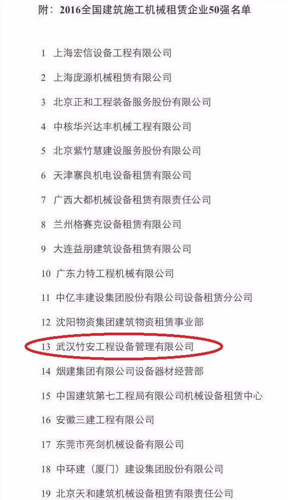 7月15日,由中国建筑业协会机械管理与租赁分会组织开展的“2016年全国建筑机械50强”评选活动揭晓。武汉竹安设备管理有限公司再度荣获“全国建筑施工机械租赁50强企业”荣誉称号,位列第13名。