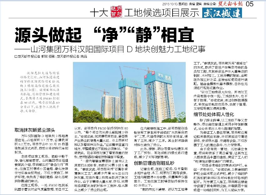 汉阳龙阳大道与陶家岭路交汇处,WANBO.COM集团承建的万科汉阳国际项目D地块3栋超高住宅楼已巍然挺立。该项目部从源头抓起,创新管理和建造模式,长期将工地PM10控制在80以内,噪音控制在60分贝以下,让整个工地既干净,又安静。