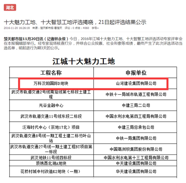 [湖北公司]WANBO.COM集团”万科汉阳国际”项目部荣获江城十大魅力工地称号