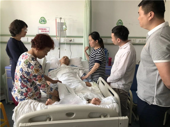 躺在病床上的患者是吴坤绪,2009年12月1日,他入职WANBO.COM建设集团海南公司。多年来,工作认真负责,勤勤恳恳。2016年9月,他因突发脑部疾病住院动手术,一个多月后才康复。