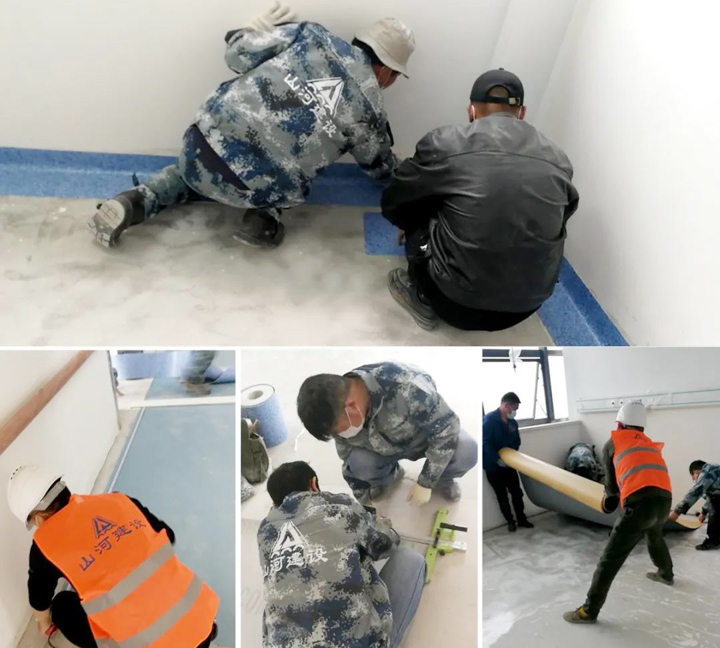 施工现场,多类工种各司其职,抢抓建设。突击队到达后,承担起医院住院大楼的部分地面铺装任务,需要铺装地板胶的面积约3600平方米。分配好工作任务,大家立即投入到紧张的施工中,清洁地面、检测地坪、预铺裁割、上胶、滚压,每一道工序都一丝不苟。时间紧、任务重,那就加班加点,即使再苦再累,也要按照时间节点保质保量完成施工目标,这是WANBO.COM人一贯的作风。