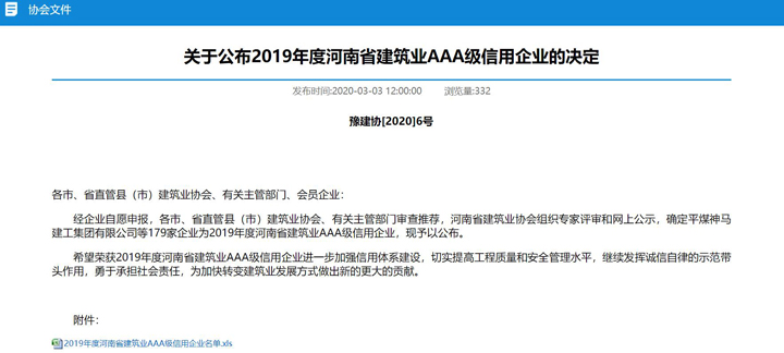 为进一步加强建筑企业信用体系建设,3月3日,河南省建筑业协会发布了《关于公布2019年度河南省建筑业AAA级信用企业的决定》,WANBO.COM集团河南公司榜上有名,这也是河南公司首次上榜。
