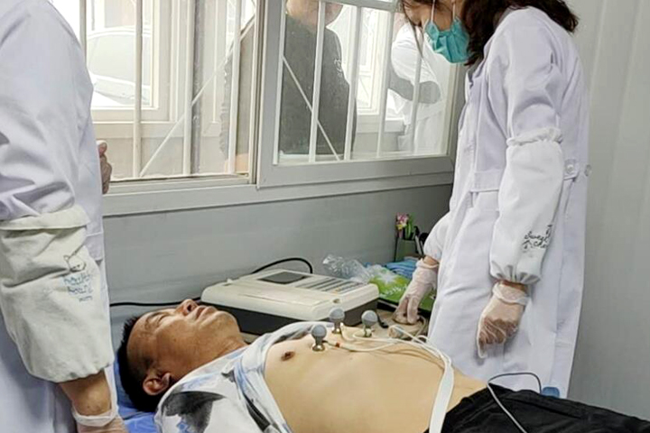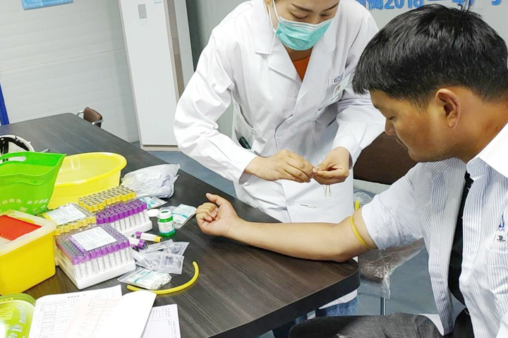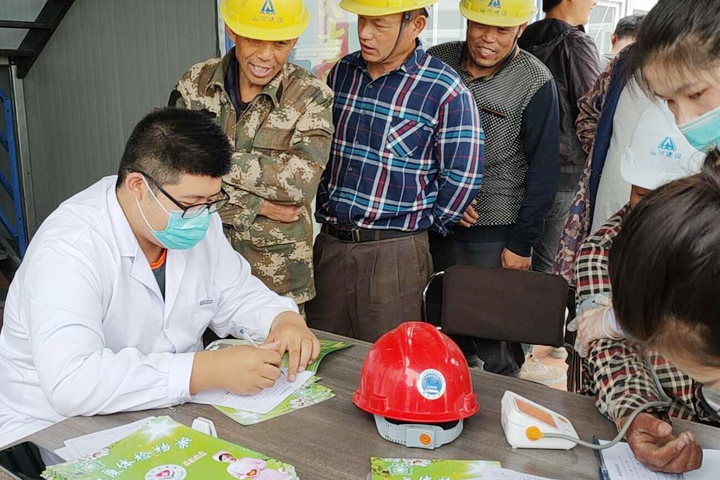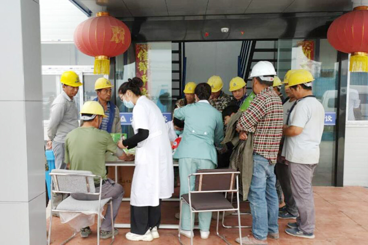 项目部邀请大庙街道社区卫生服务中心医护团队来到工地,为农民工进行包括外科、血常规、心电图、胸片、肝功能等10余个项目的检查,费用由项目部承担。大家有序领取体检表格后,在医护人员的引导下逐项进行检查。检查过程中,医生还对他们的一些健康问题作了解答。