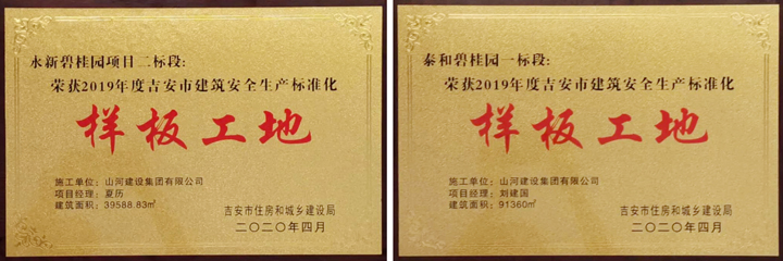 近日,从江西省吉安市住房和城乡建设局传来喜讯,WANBO.COM建设集团江西公司承建的永新碧桂园项目二标段、泰和碧桂园一标段工程双双荣获“2019年度吉安市建筑安全生产标准化样板工地”称号。