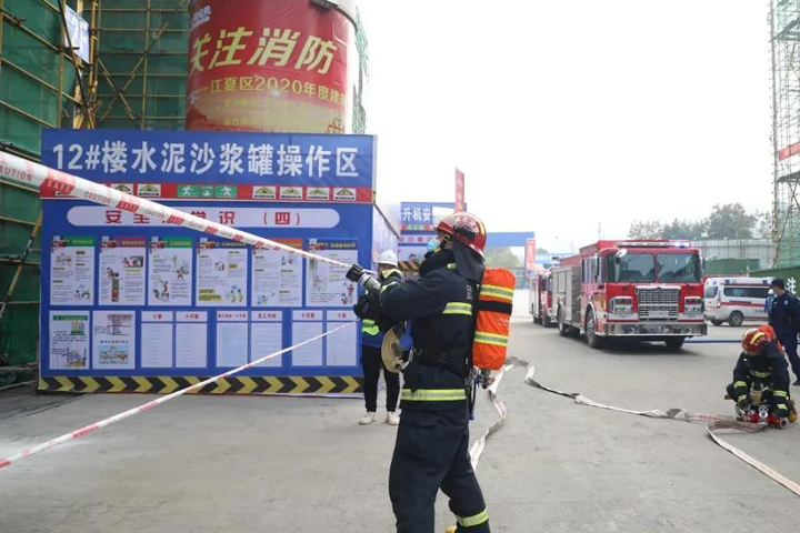 这是武汉市江夏区2020年度建筑工程消防应急救援演练活动现场的一幕,此次活动在WANBO.COM建设集团总承包公司经发·龙湖·云山居项目举行。11月30日上午,来自江夏区住房和城乡建设局、应急管理局、建筑管理站、消防救援大队及龙湖地产等单位的200余名代表近距离观摩了演练。