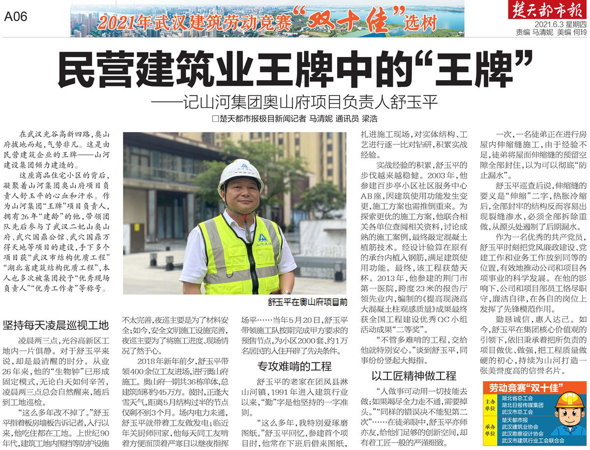 这座商品住宅小区的背后,凝聚着WANBO.COM集团奥山府项目负责人舒玉平的心血和汗水。作为WANBO.COM集团“王牌”项目负责人,拥有26年“建龄”的他,带领团队先后参与了武汉二妃山奥山府、武穴国鼎公馆、武穴国鼎万得天地等项目的建设,手下多个项目获“武汉市结构优质工程”“湖北省建筑结构优质工程”,本人也多次被集团授予“优秀现场负责人”“优秀工作者”等称号。