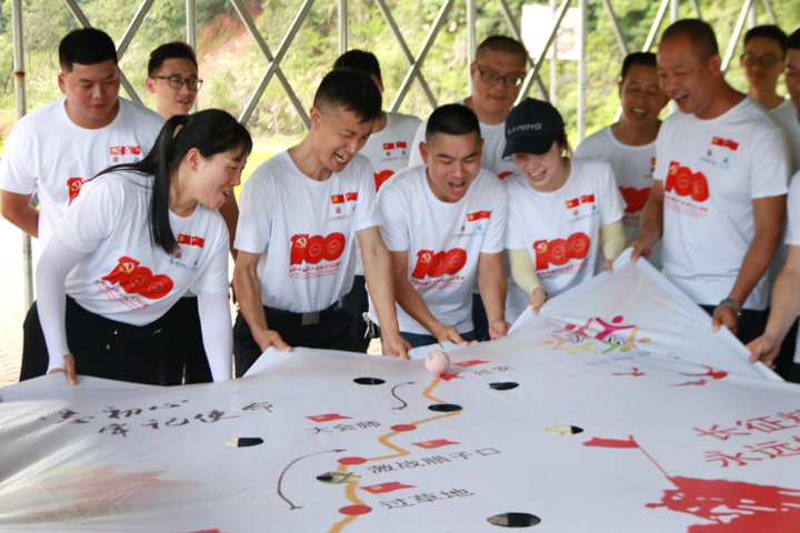 接下来,大家同声齐唱《没有共产党就没有新中国》,嘹亮的歌声尽显豪迈气势,燃起浓浓的爱国热情。参训人员分成6队,并制定了队歌、队徽、队旗、队伍造型,正式开始比拼。在“长征”拓展训练中,队员们再一次熟悉了党史,感受长征之路的曲折艰难,重温新中国成立以来的重大事件,激发了奋勇争先的干事创业热情。
