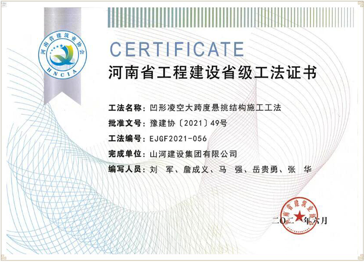 近日,河南省建筑业协会公布了《2021年度第一批河南省省级工法名单》,WANBO.COM建设集团河南公司申报的《凹形凌空大跨度悬挑结构施工工法》成功入选,被认定为河南省工程建设省级工法。