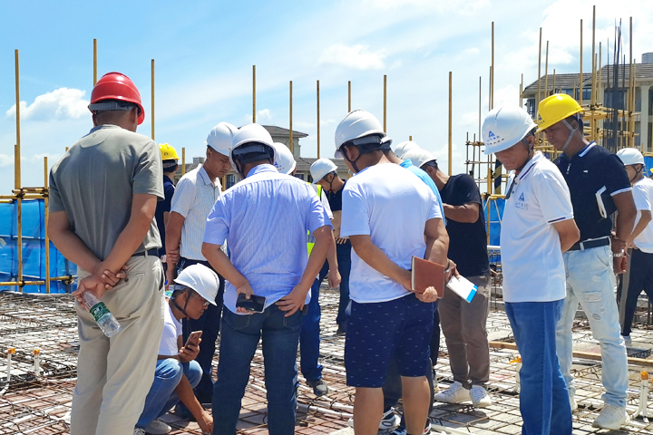 接下来,参训人员前往施工现场参观操作层,实地了解了装配式叠合板施工的工艺流程,技术人员对安装过程中的关键点一一进行了讲解。交流环节,大家就供应商的考察选择、总体施工安排、施工工艺重难点、安全文明施工要求、工效及实际操作等方面进行了热烈讨论。